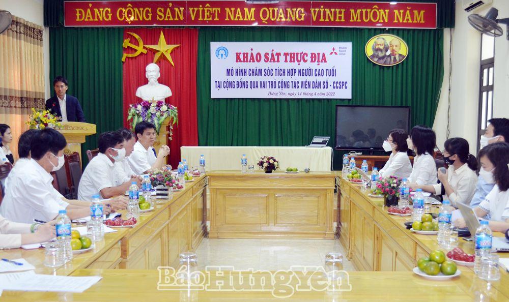 Ngày 14.4, Chi cục Dân số - Kế hoạch hóa gia đình làm việc với Viện nghiên cứu Mitsubishi (Nhật Bản) nhằm khảo sát thực địa mô hình "Chăm sóc tích hợp người cao tuổi tại cộng đồng qua vai trò cộng tác viên dân số - CCSPC" tại tỉnh Hưng Yên.