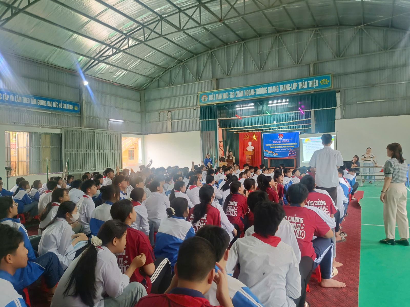 Tham dự chương trình có đại diện Trạm Y tế, Đoàn Thanh niên xã, Ban Giám hiệu nhà trường cùng cán bộ, giáo viên và đông đảo học sinh của hai nhà trường.